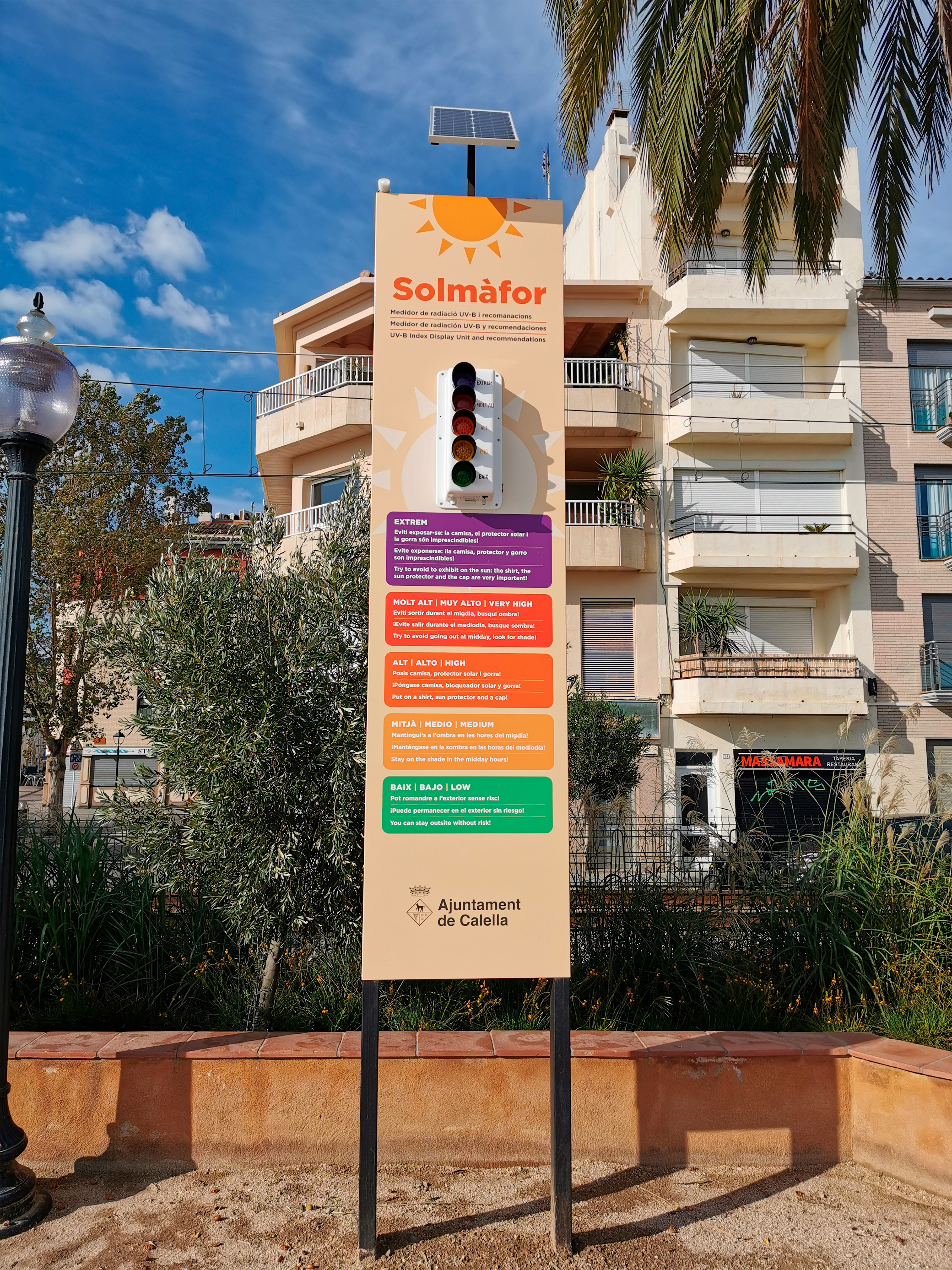 На каталанском, испанском и английском языках солмафор объясняет линию поведения при определенной солнечной активности.
