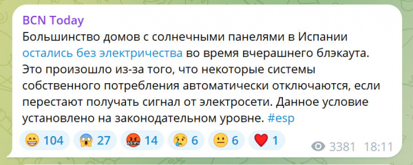 Во время обсуждения испанского блэкаута многие комментаторы высказывали резонные предположения о том, что, мол, владельцам солнечных батарей, коих в Испании уже немало, во время блэкаута была лафа - у них свет был. А я как раз и говорил о том, что у всех моих знакомых, которые себе поставили батареи, света не было точно так же, как у остальных - я у них на эту тему интересовался. И мы еще обсуждали, почему такое произошло: неужели они не озаботились покупкой соответствующего оборудования, чтобы оно могло работать в автономном режиме?