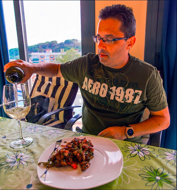 Вчера у Старого Каталана сольтеадо отведали. Это что-то типа ирландского рагу: валишь в вок все, что попадается под руку и обжариваешь. Получилось просто очень вкусно. И меня засняли в процессе, который характеризуется как: "Вот сейчас ка-а-а-а-ак отведаю"!
