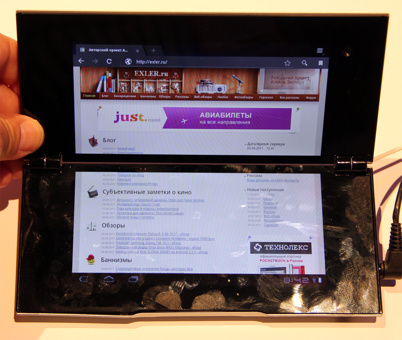 Очень удобно использовать как печатающую машинку. Вниз вывел виртуальную клаву а верхней части экран. Я все ждал, когдаж на рынке появится такое. Сейчас на таблетках набирать текст некомильфо. А так хочется записать быстренько тексты в дороге или где ожидаешь чего. Набирать конечно набираю, благо текстовых редакторов много для андроида, но все равно медленно. Если положить андроид то удобно набирать, но плохо виден текст, если на весу повернуть как надо то не удобно набирать. Вобщем хорошая штука эта Tablet P.