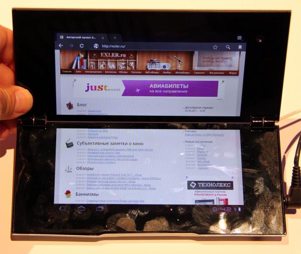 Вот только реализация этой идеи, судя по фото, оставляет желать лучшего (мягко говоря): большая разделительная полоса между экранами, огромные неиспользуемые поля, большие выступающие петли и т.д.