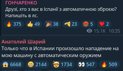 Прокремлевский блогер Шарий в своем ТГ сообщил, что, дескать, его машину обстреляли из автоматического оружия. Также он же сообщил, что якобы испанские силовики получили информацию о подготовке покушения на него.