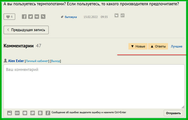 И во-вторых: сразу же зарегистрированный пользователь обращает внимание, что прямо возле слова "Комментарии" есть сортировка. И если что, можно выставить просто как удобно самому.