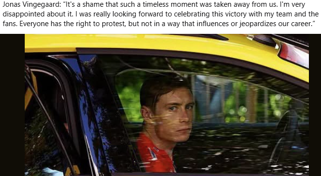 «Мы должны осознавать, что спорт по своей сути — это объединение. Он может строить мосты и способствовать взаимопониманию. Но участники должны быть защищены, они не могут становиться жертвами общественной дискуссии. Дебаты всегда должны оставаться за пределами сферы деятельности спортсменов. Спортсмены должны быть свободны в борьбе на своем поле боя, в нашем случае — на дороге. В противном случае под угрозой оказывается сама сущность спорта как объединяющей силы».