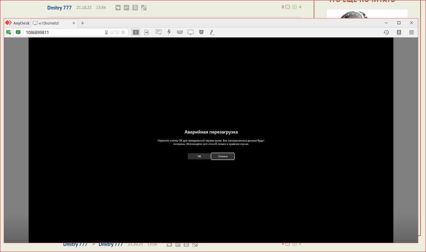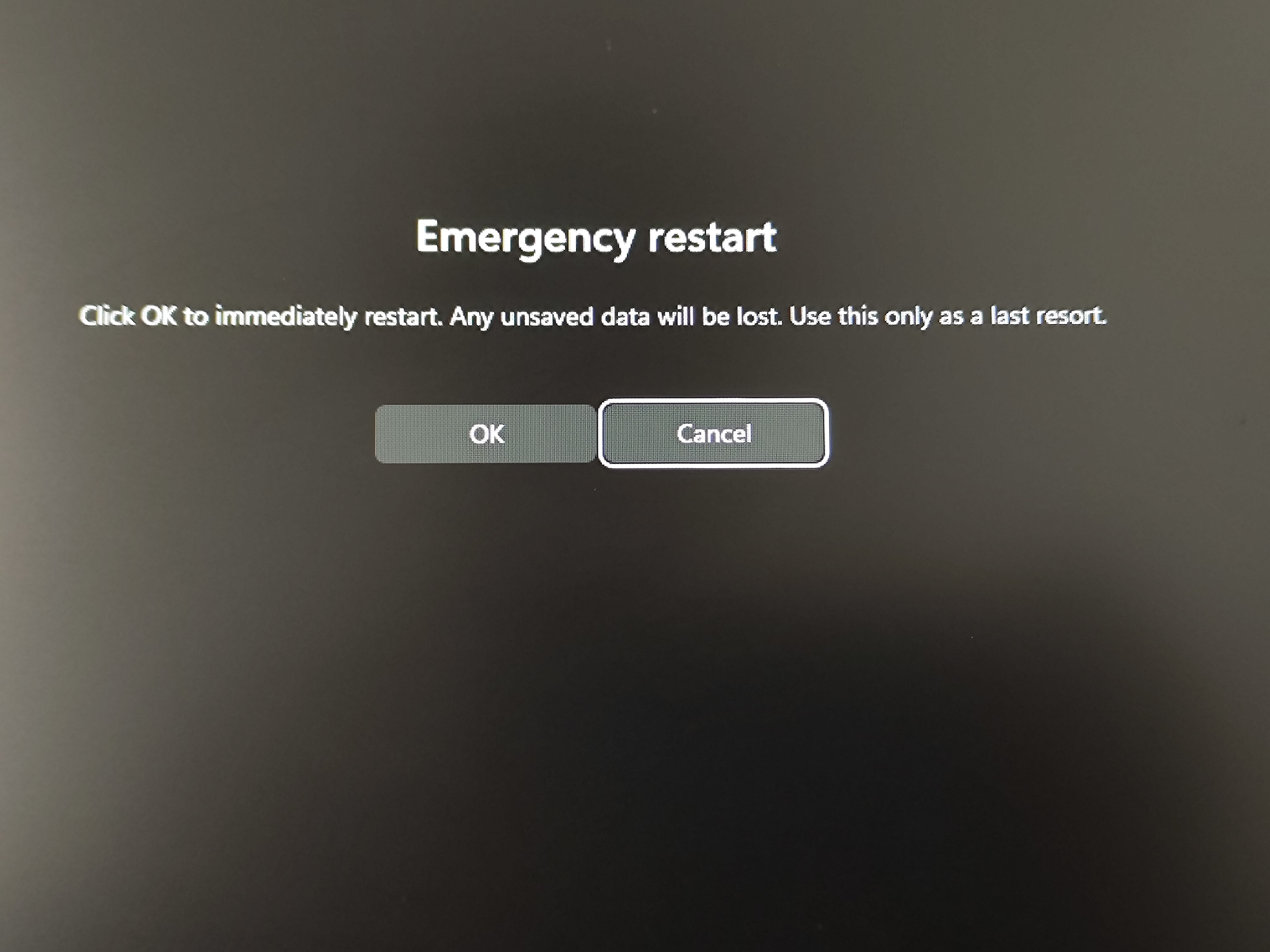 Это действие приводит к появлению на экране сообщения о попытке аварийной перезагрузки и добавлению: «Нажмите «ОК» для немедленной перезагрузки. Все несохранённые данные будут потеряны». В конце сообщения говорится: «Используйте это только в крайнем случае». Нажмите «ОК», и ваш компьютер выключится и включится в обычном режиме.