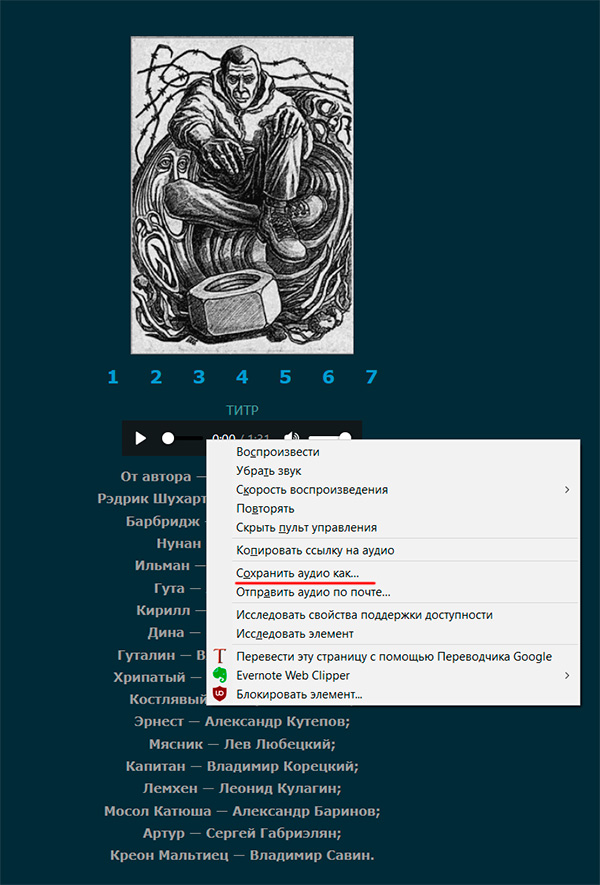 Еще один замечательный раздел - "Советские радиоспектакли". Можно слушать прямо на сайте, а можно скачивать в виде MP3-файлов - для этого нужно щелкнуть правой кнопкой мыши по плееру и выбрать "Сохранить аудио как...".