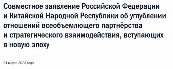 21 марта 2023 года после того как господин Си вручил Путину ярлык на княжение и строго сказал недорогим россиянам снова выбрать Путина в 2024 году, потому что это отвечает интересам господина Си, на сайте "Президент России" было опубликовано совместное заявление.