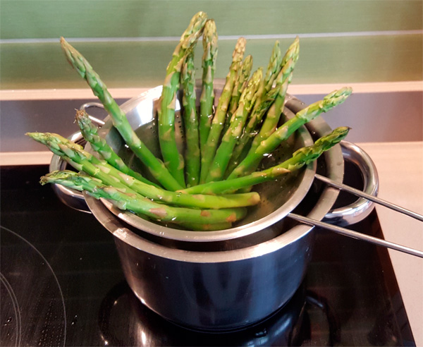 Вода в кастрюле доводится до кипения, подсаливается, также туда можно бросить пару ломтиков лимона. В воду ставится сетка (дуршлаг) со спаржей и в кипящей воде варится 4-8 минут в зависимости от толщины стеблей. Спаржу как на фото я варю 6-7 минут.