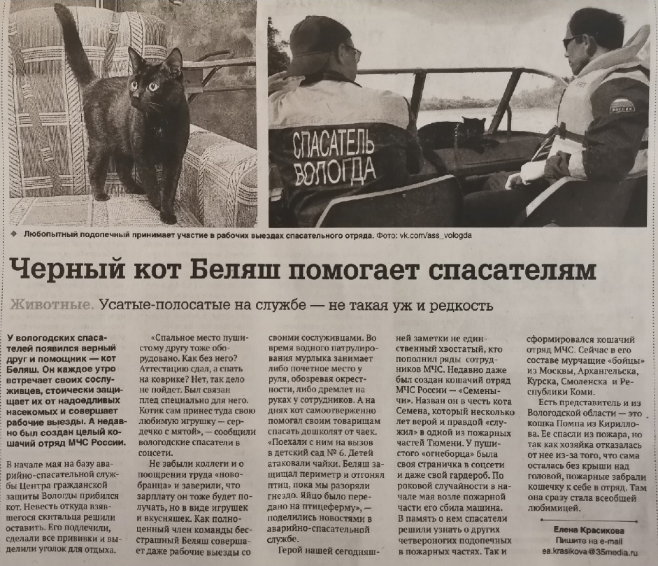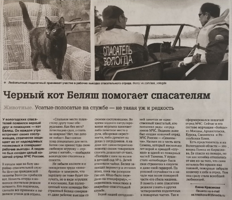 В мае этого года в Аварийно-спасательной службе города Вологды появился черный кот по кличке Беляш. Он сразу стал любимцем всей группы спасателей, а через непродолжительное время был аттестован на допуск к работе.