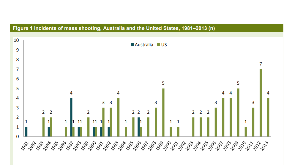 Мне кажется, вы немного упустили суть вопроса вашего оппонента, позвольте я вам помогу - что именно случилось в Австралии в 1996 году такого, что привело к нулевому уровню масс-шутингов, как минимум в промежутке до 2013 года.