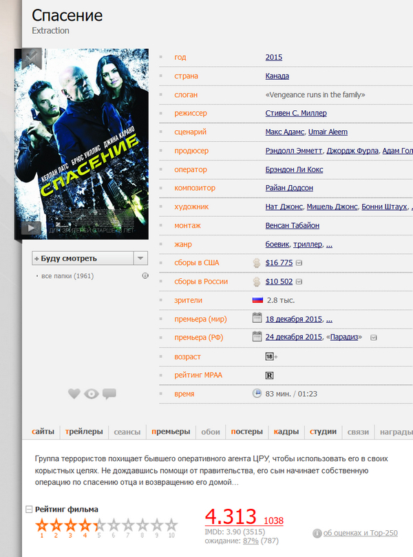 Новый фильмец - "Спасение". Канадского режиссера, у которого ни один фильм даже до шестерки на IMDB не дотянул, то есть все полный кошмар. У данного шедевра на IMDB - 3,9! 3,9, Гоша!