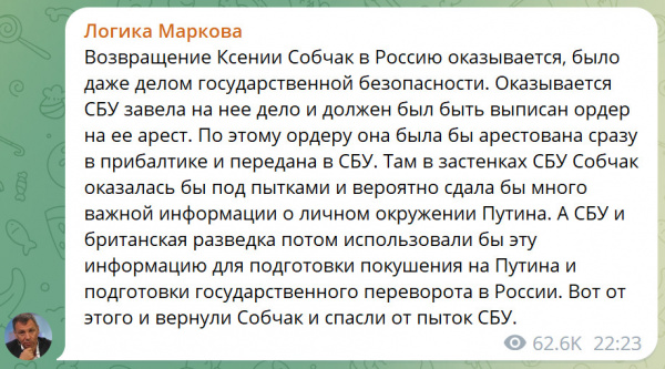 Однако мне было интересно прочитать мнение выдающегося политолога современности Сирожи Маркова об истинных причинах такого скорого возвращения Собчак. Оказывается, дело там было - государственной важности, понимать надо! Спасли Рассею, слава богу, не допустили государственного переворота!