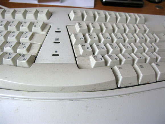 Клава чистится достаточно легко. Нужны антибактериальные влажные салфетки (сойдут и влажные салфетки для протирки монитора), немного спирта или водки, несколько ватных дисков и десяток ватных палочек. Если не страдать перфекционизмом, то клава приводится во вполне приличное состояние минут за десять.