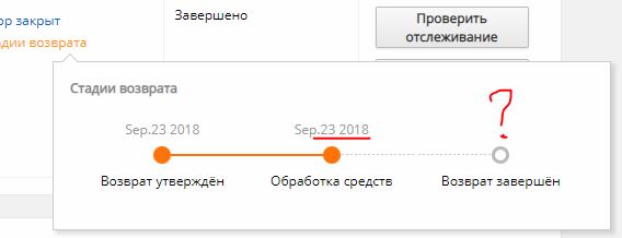 То что зависит от банков проходит за 2-3 дня. А пока нет метки что возврат завершен, значит али в банк информацию еще не передал.
