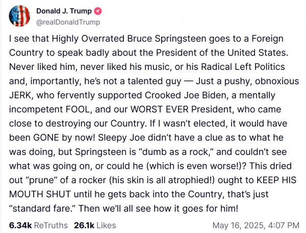 Я вижу, что сильно переоцененный Брюс Спрингстин едет в другую страну, чтобы плохо отзываться о президенте Соединенных Штатов. Никогда его не любил, никогда не любил его музыку или его радикально левые политические взгляды, и, что важно, он не талантливый человек — просто назойливый, неприятный придурок, который горячо поддерживал лживого Джо Байдена, умственно неполноценного дурака и нашего ХУДШЕГО президента, который чуть не разрушил нашу страну. Если бы я не был избран, его бы уже давно не было! Сонный Джо не имел ни малейшего представления о том, что он делает, но Спрингстин "туп как пробка" и не мог понять, что происходит, или мог (что еще хуже!)? Этот высохший «чернослив» рок-музыкант (у него кожа вся атрофирована!) должен ДЕРЖАТЬ РОТ НА ЗАМКЕ, пока не вернется в страну, это просто «стандартная процедура». Тогда все увидим, что с ним произойдет!