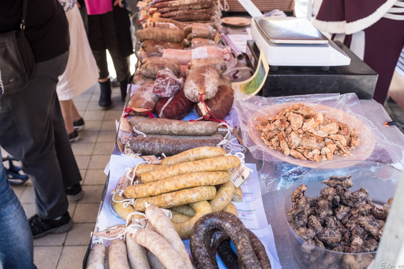 На первом плане слева - Llardons. Страшно популярная штука - холодные шкварки. То есть свиное сало, обжаренное и охлажденное. Постоянно на ярмарках продается, раскупается отлично. Дениса Руденко этой штукой угостили в одном из винных хозяйств (производящих каву, игристое) - ему очень понравилось.