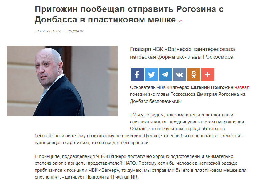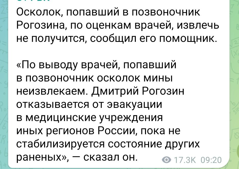 Позже экс-глава «Роскосмоса» подтвердил, что был ранен в спину. «Жить буду. Осколок [прошел] в сантиметре от позвоночника», — рассказал он RT. (Отсюда.)