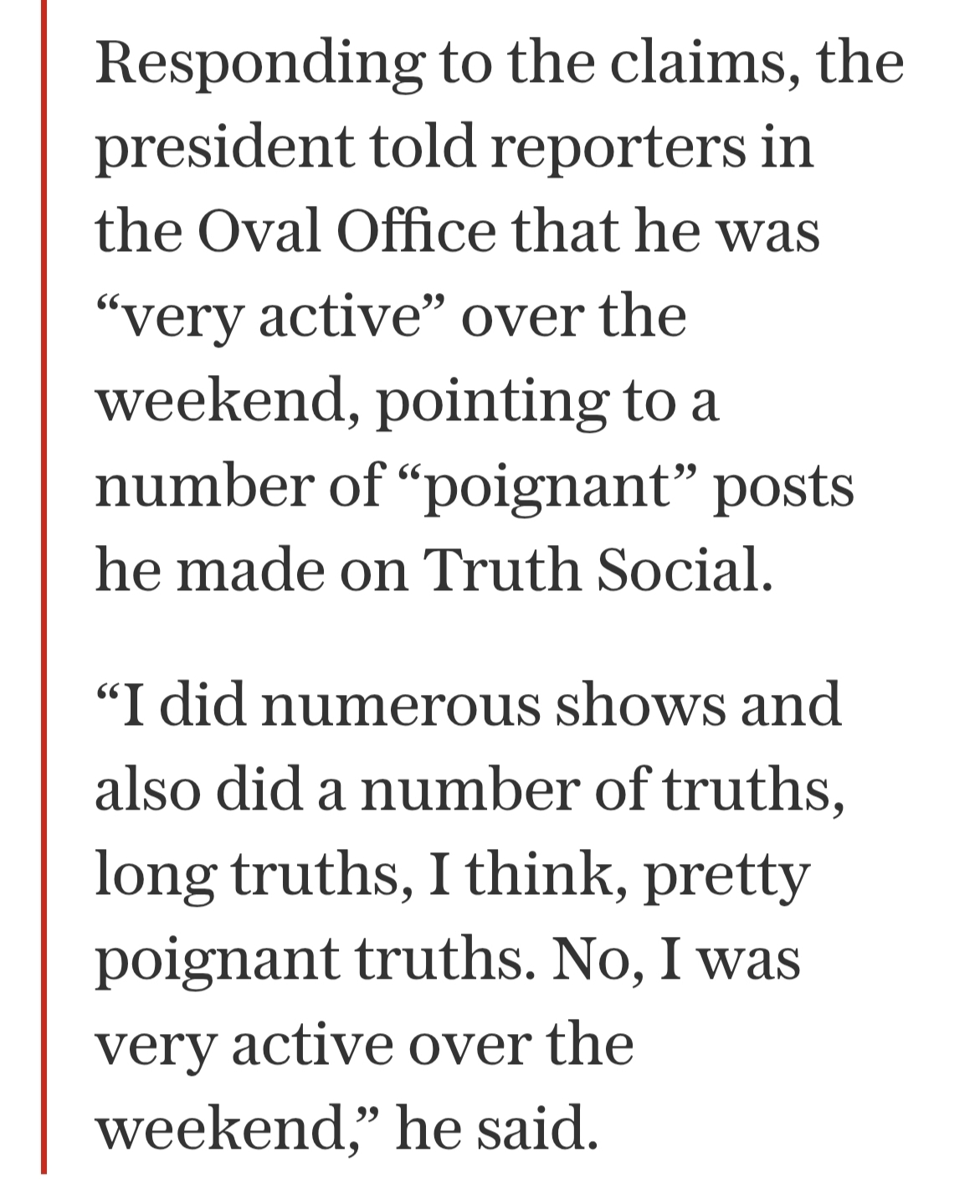 Ну и битый час: я остановил семь войн; демократы сфальсифицировали выборы; Байден был неработоспособен; тарифы принесли Америке триллионы долларов; кстати, и с председателем Си у меня отличные отношения.