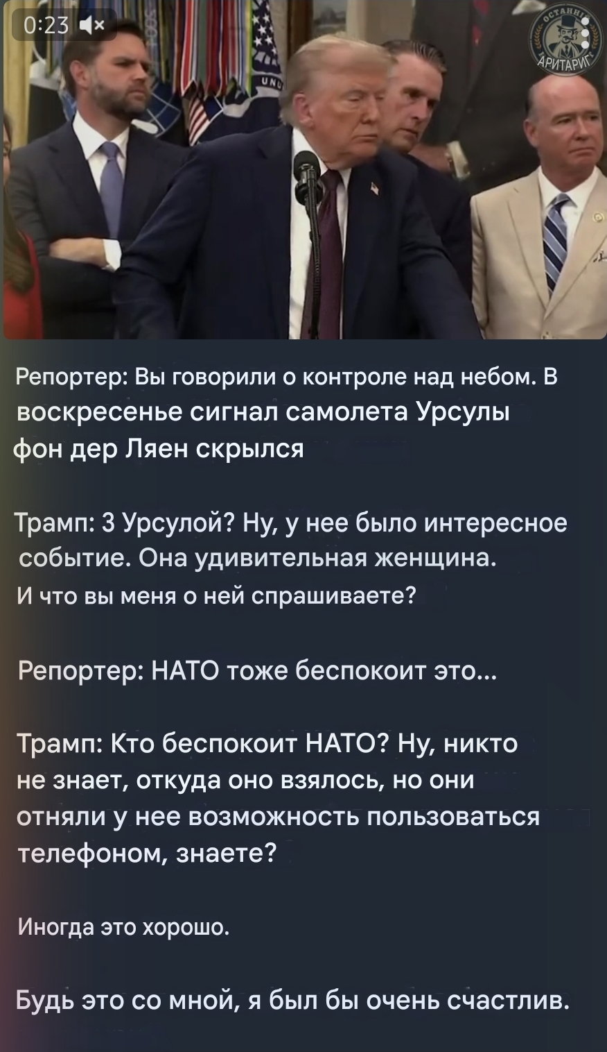 Да, отличная встреча была, нам понравилось. А если из этого ничего не выйдет (что странно, потому что уже ничего не вышло), то Трамп тогда займет другую позицию - например, даст еще две недели. Или два года. В общем, мирный процесс идет на всех парах. Ждем Трампу Нобелевку 10 октября.