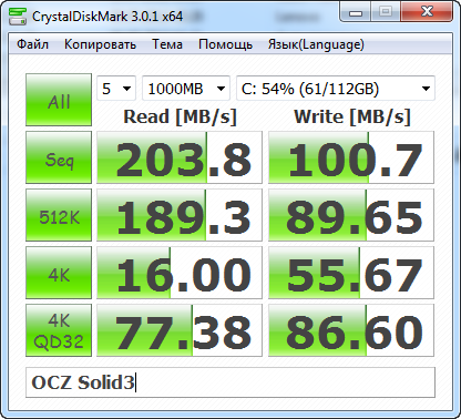 Только надо иметь ввиду, что используемый в этом SSD контроллер SandForce показывает такую выдающуюся скорость записи только на сжимаемых данных. Архивы там, рипы и пр. будут писаться на порядок медленнее.