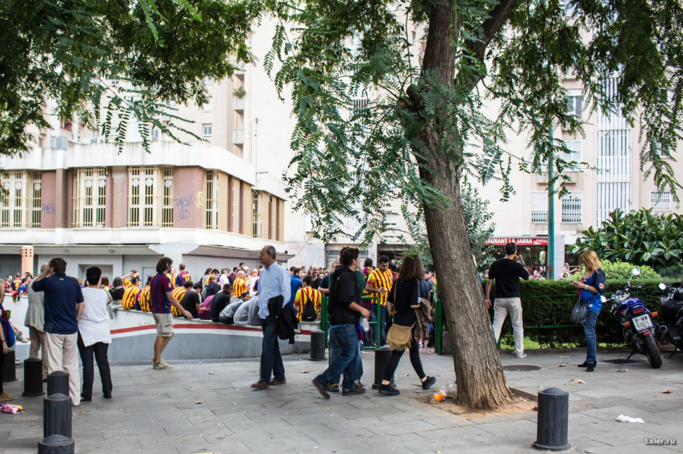 Часа за два до начала матча все близлежащие улицы в радиусе одного-двух километров были заполнены людьми в майках "Барсы". Люди периодически что-то скандировали и болтали друг с другом. Что интересно, никто ничего не пил - я буквально единицы видел с банками с пивом.