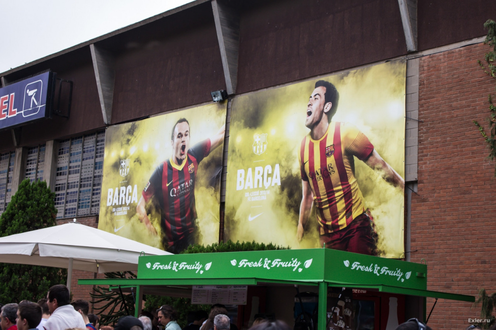 Этих маек существует строго два вида: вот они на плакатах, висящих на стене стадиона. Первый вид - сине-гранатовые полосы, фирменные цвета "Барсы". Второй вид - желто-красные полосы, символизирующий флаг Каталонии, который тут вывешивают в каждом третьем-четвертом окне. (Все фото - кликабельны.)