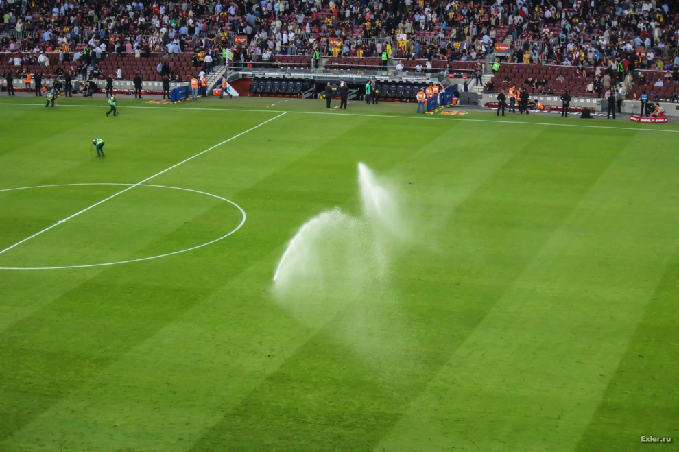 Первый тайм окончен со счетом 1:0, начинается поливка и уборка поля.