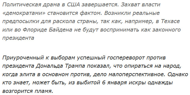 Наблюдать за этим очень любопытно. Если учесть, что за Трампа на прошедших выборах проголосовало 75 миллионов человек, а за Байдена - порядка 80 миллионов, то это означает, что сейчас одна половина Америки совершенно беспрецедентным образом пытается наглухо закрыть рот другой половине Америки.