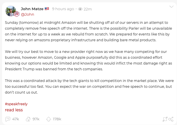 Компания запланировала отключение Parler от своих сервисов на 10 января 23:59 по тихоокеанскому времени (10:59 мск). «Возможно, что Parler будет недоступен в интернете на протяжении недели, пока мы будем воссоздавать его с нуля. Мы готовились к этому, не полагались на проприетарную инфраструктуру Amazon и создавали продукты в железе»,— написал господин Матце в своем аккаунте в Parler. Он обвинил Amazon в намерении «полностью убрать свободу слова в интернете», а крупных технологические компании в целом — в координированной попытке уничтожить конкурента. (Отсюда.)