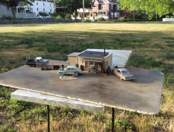 Он из самых разнообразных материалов создает сценки-макеты, затем помещает их в обычное уличное окружение и фотографирует так, чтобы соблюдались определенные пропорции. Вот тут это видно наглядно.
