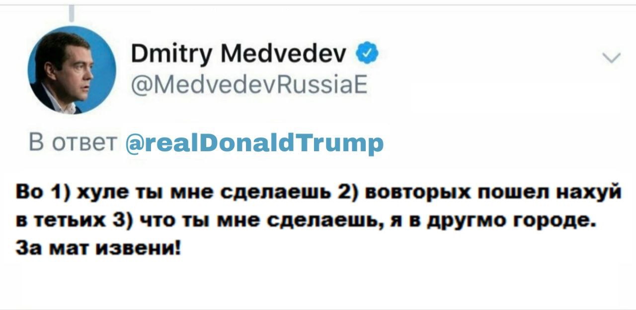 Мне плевать, что Индия делает с Россией. Пусть они вместе разваливают свои мертвые экономики, мне все равно. Мы очень мало торгуем с Индией, их тарифы слишком высоки, одни из самых высоких в мире. Точно так же Россия и США почти не торгуют друг с другом. Давайте оставим все как есть и скажем Медведеву, провалившемуся бывшему президенту России, который все еще считает себя президентом, чтобы он следил за своими словами. Он вступает на очень опасную территорию!