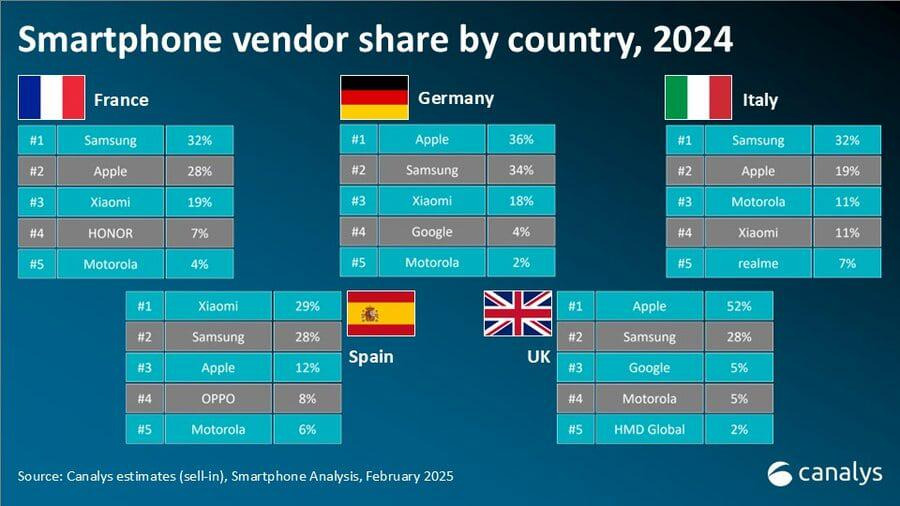Я почему-то думал, что почти везде в Европе, как и в США, айфон на первом месте. А вот оно как.
