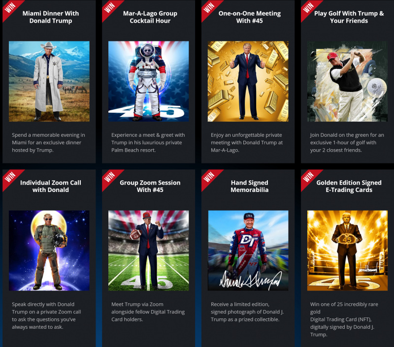 Картинки, судя по всему, нарисованы каким-то искусственным интеллектом, коих в последнее время расплодились тонны, при этом также Трамп среди покупателей обещает разыграть ужин с ним в его особняке, часовую игру в гольф с ним или уникальную возможность приватного танца разговора с ним один на один по Zoom.