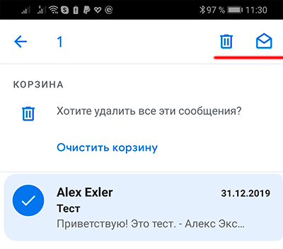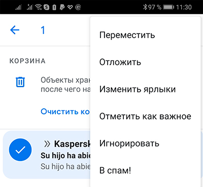 С настройкой как на скрине, почта при удалении из входящих в Gmail android - удалилась полностью с сервера. После изменения настройки на: "Не проверять" - письмо осталось на сервере во входящих даже после удаления из корзины Gmail android.