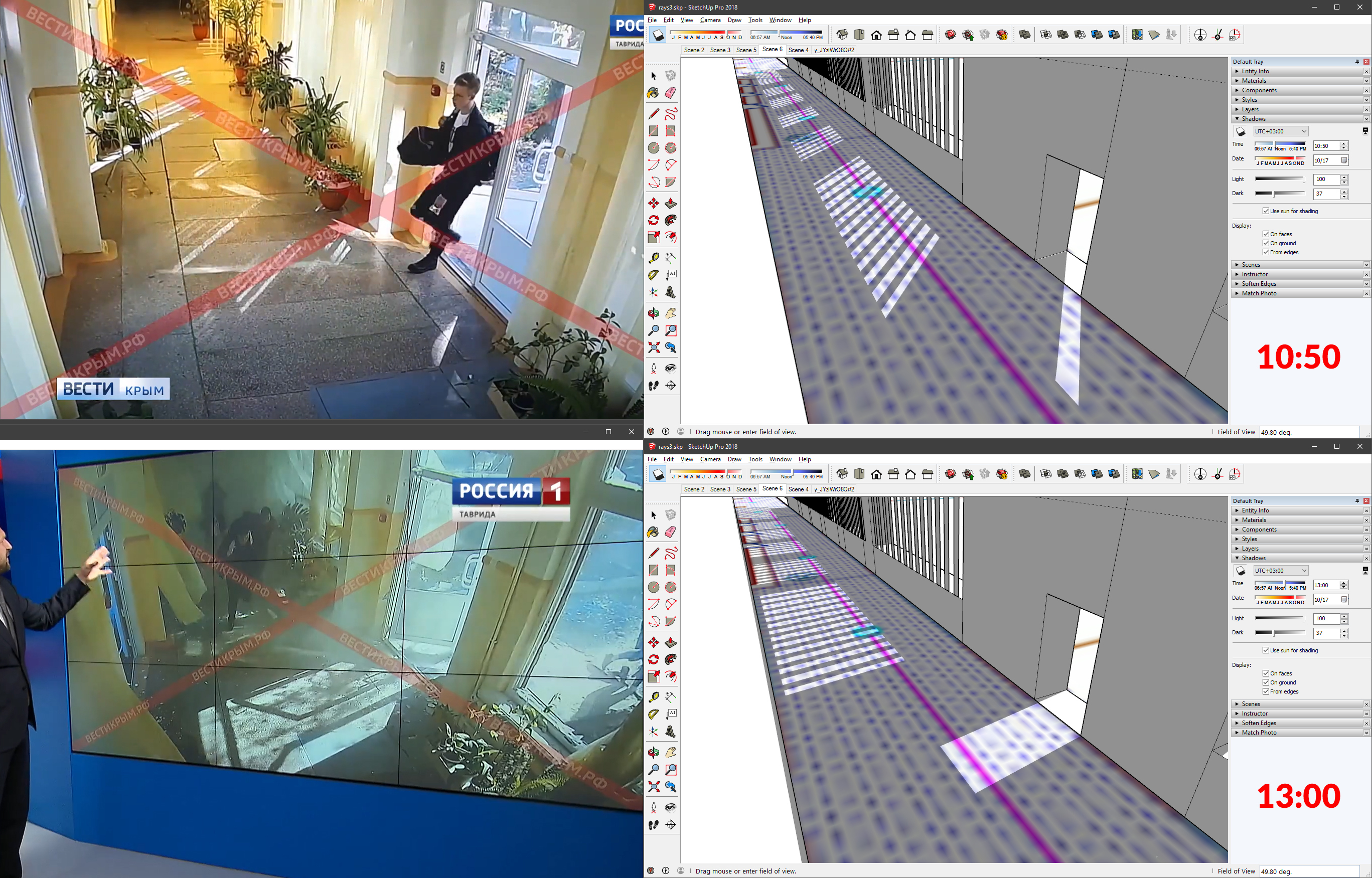 Видео с керченским стрелком было смонтировано из частей, снятых в разное время, или разные дни, что доказывает анализ теней.