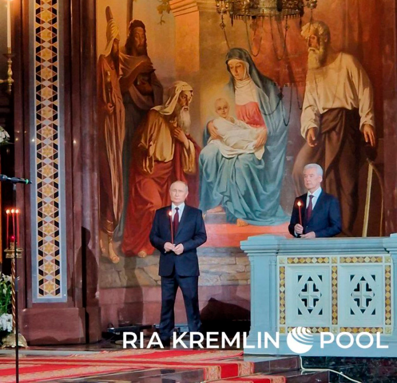 Еще странность. На фото с сайта кремля все прихожане в масках (и та самая "рыбачка" тоже там, кстати). Но маски уже отменили, и скорее всего в этом году все прихожане были без масок уже