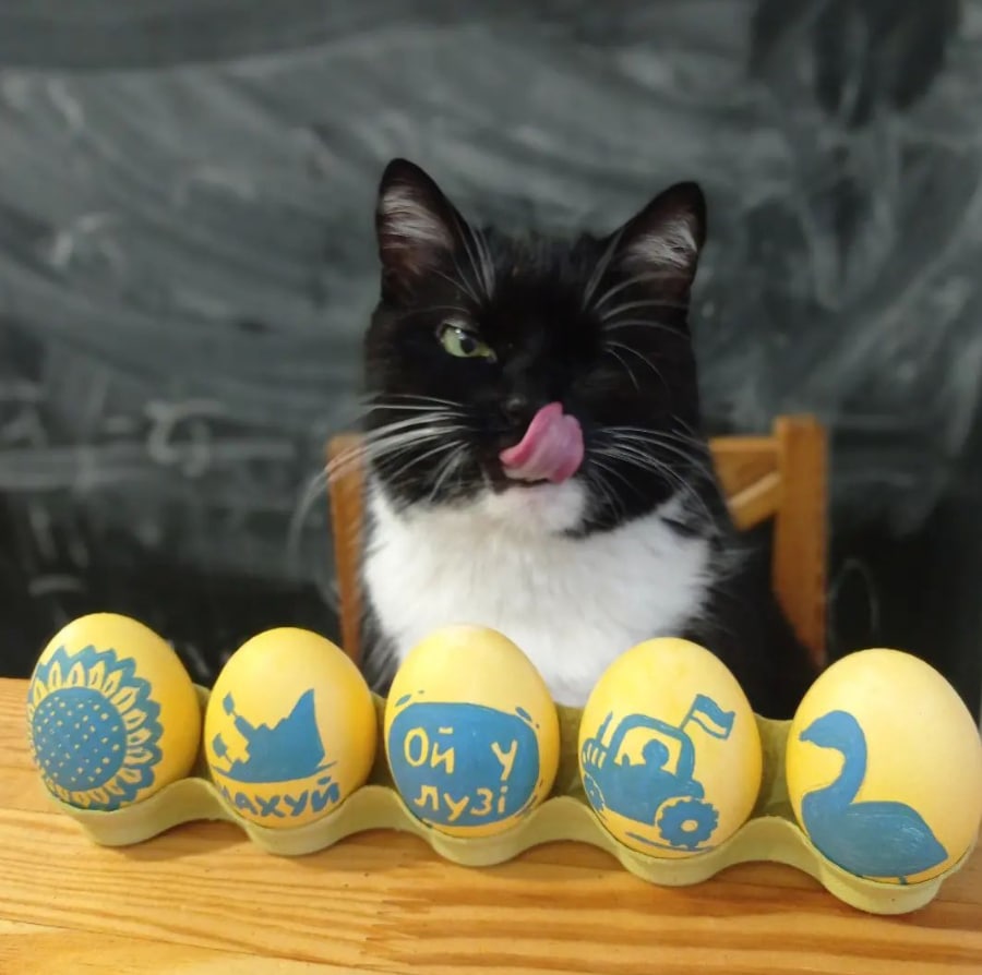 Знакомьтесь – кот Бандера с Прикарпатья. Накануне Пасхи пушистый блогер сфотографировался на фоне пасхальных яиц с патриотическими рисунками.