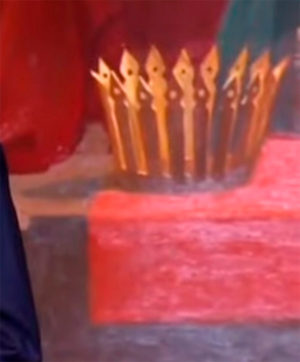 И с короной ничего не вижу. На обоих кадрах она расположена на краю материи, у стола левее выщербина. Просто первый раз снято почти перпендикулярно, второй раз - под острым углом.