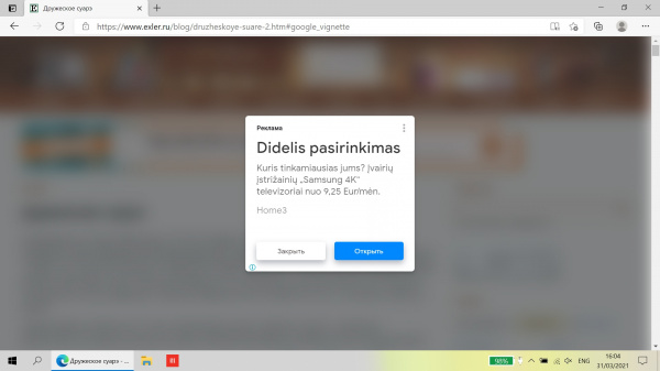 Все-таки AdGuard или иной адблокер в современных условиях - must have. Для домена exler.ru, как и для некоторых других, у меня блокировка отключена, но по умолчанию включена. Моё время стоит дорого. Дороже их рекламы. Само-то содержание рекламы я всегда игнорирую, это уже мой встроенный в мозг "adguard" работает. Так что даже не помню, что там мне выскочило в том окне.