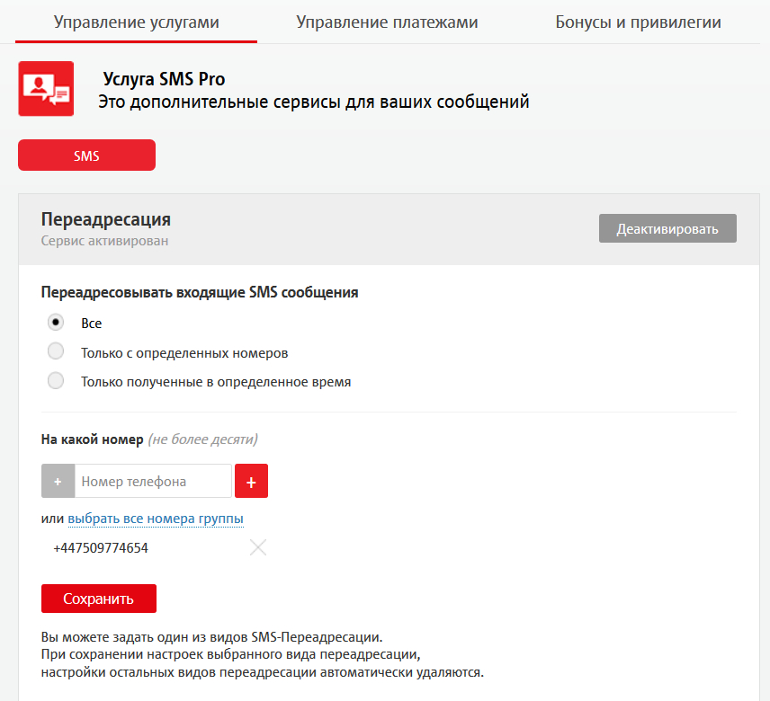 Однако! Эта переадресация работает только с обычными SMS, отправленными с длинных номеров. SMS с коротких номеров, а их как раз используют банки, мессенджеры и так далее - не переадресуются. Я это все в свое время выяснил, когда пытался переадресовывать банковские SMS на свой испанский номер. Ну и на всякий случай вчера еще проверил - такие SMS приходят только на оригинальный номер.