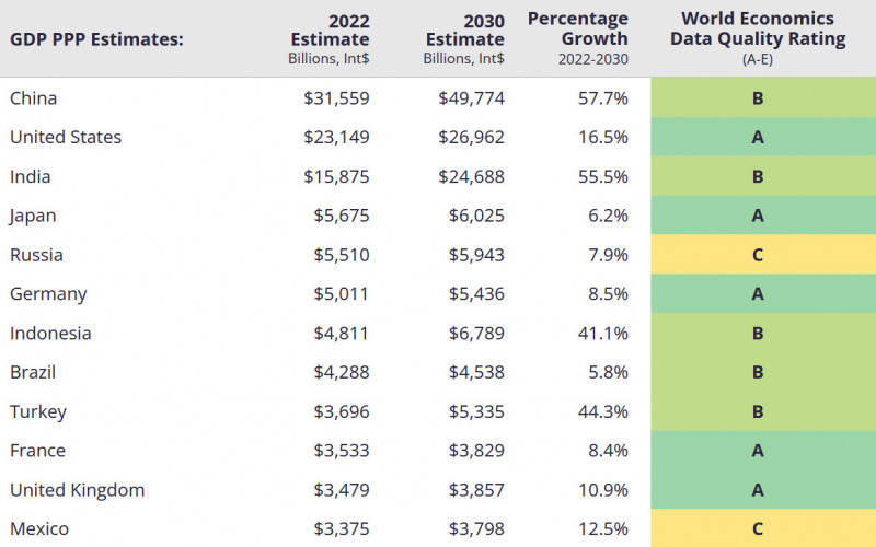 Согласно исследованию World Economics, первое место за 2022 год занимает Китай, ВВП которого оценили в $ 31,559 млрд. В первую пятерку также попали США ($ 23,149 млрд), Индия ($ 15,875 млрд) и Япония ($ 5,675 млрд). ВВП России оценили в $ 5,51 млрд.