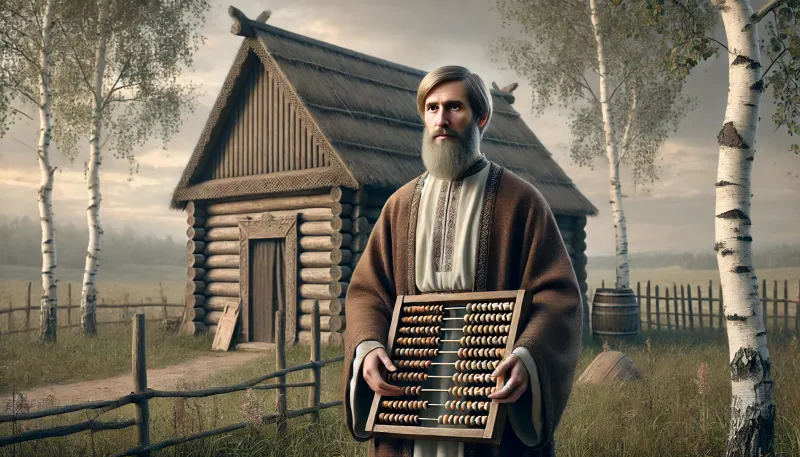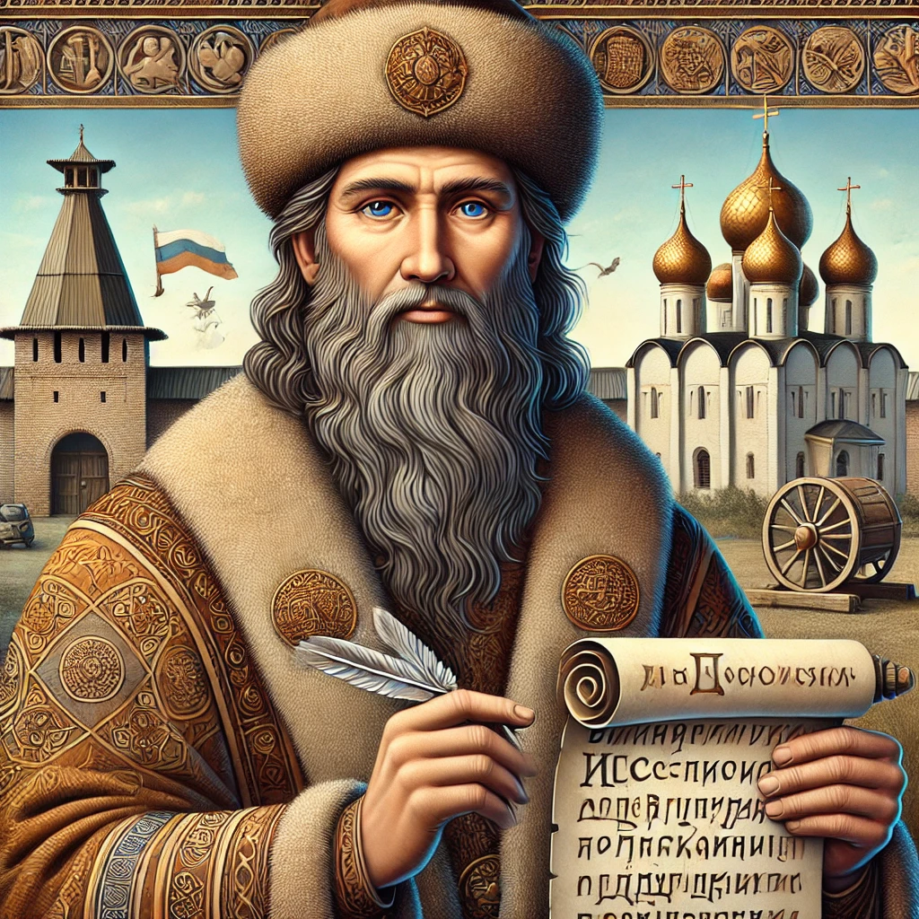 «A detailed medieval-style portrait of Kirik Novgorodets, the first known Russian mathematician, scholar, and thinker, from the 12th century. He is depicted in traditional 12th-century Russian clothing, including a long robe and a fur-lined hat, holding a quill and an ancient scroll with Slavic script. The background features elements of 12th-century Novgorod, such as wooden architecture and a peaceful natural landscape. His expression is wise and contemplative, reflecting his intellectual and spiritual contributions to Russian culture. The style is realistic and inspired by medieval Russian iconography.»