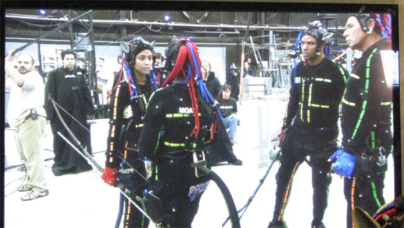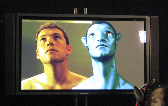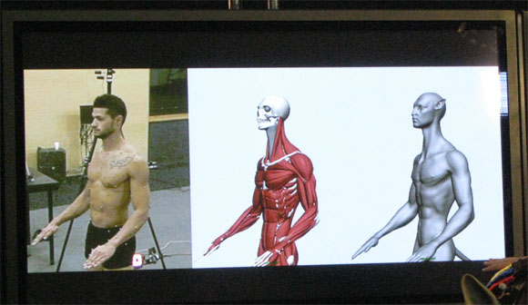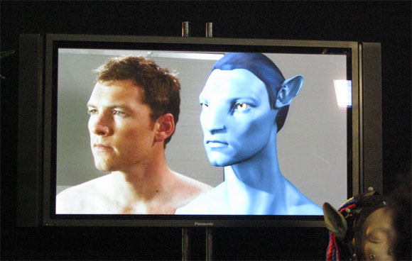 Далее показали процесс обработки съемки реальных актеров и превращение их в пандорианцев. Одно из важных нововведений, сделанных в "Аватаре" для технологии motion capture, это видеокамера, прикрепленная напротив лица актера, которая непрерывно фиксирует его мимику.