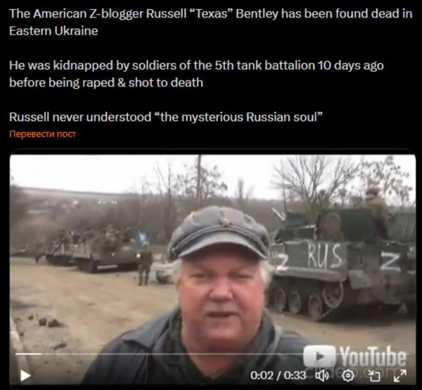 Несколько дней назад Бентли по прозвищу "Техас" (прим. Экслера: звучит как-то странно, должно было быть "Бентли по прозвищу Жигули") был не очень понятно за что задержан танкистами из 5-й бригады армии РФ и похищен. Его жестоко пытали, изнасиловали, после чего убили как собаку. На этом и закончилась священная война техасского лесоруба за "Русский мир".