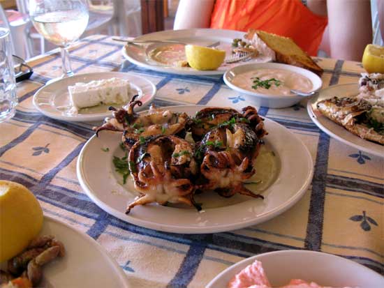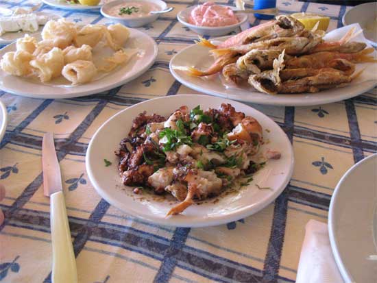 Обожаю морскую еду - всяких кальмаров, осьминогов, каракатиц и так далее. На Кипре друзья нам показали одну таверну для местных, в которой обалденно готовят. Перед заказом хозяйка ведет вас к холодильнику и показывает "меню" - свежайшую рыбу и морепродукты, из чего выбираешь, что будешь кушать. Готовят с какой-то дикой скоростью (минут через 10 все заказанные горячие блюда уже стоят на столе) и все безумно вкусно.