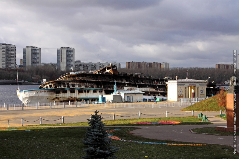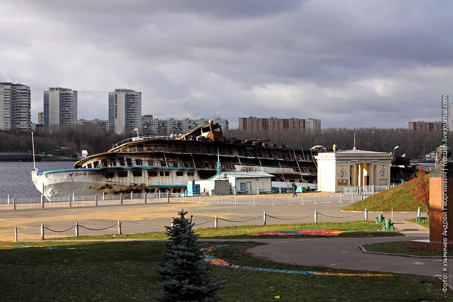 16 ноября 2011 года. Второй день после пожара. Полностью выгоревший и с затопленной кормовой частью теплоход «Сергей Абрамов» лежит у причала Северного речного вокзала Москвы. Наблюдается крен на правый борт.