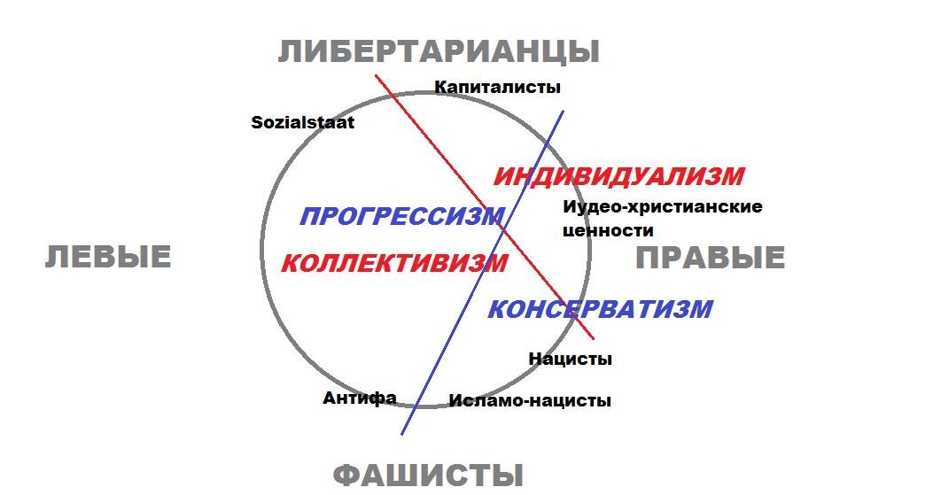 У меня ещё более простая модель. Фундаментальными в ней являются оси "коллективизм - индивидуализм" и "прогрессизм - консерватизм". Правизна, левизна, либертарианизм и фашизм являются уже сегментами производного от них пространства.