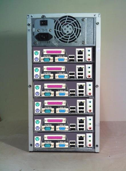 Что-то я не очень понимаю в чём дело. Ну взял человек 6 компов и собрал всё это дело в одном корпусе с помощью напильника. Ну и в чём дело? Так бы стояло 6 отдельных машин а так один ящик.