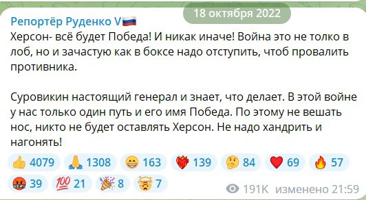 Суровикин же чем-то там командовал. И во время его командования оставили Херсон, так что, это он бомбить может легко...