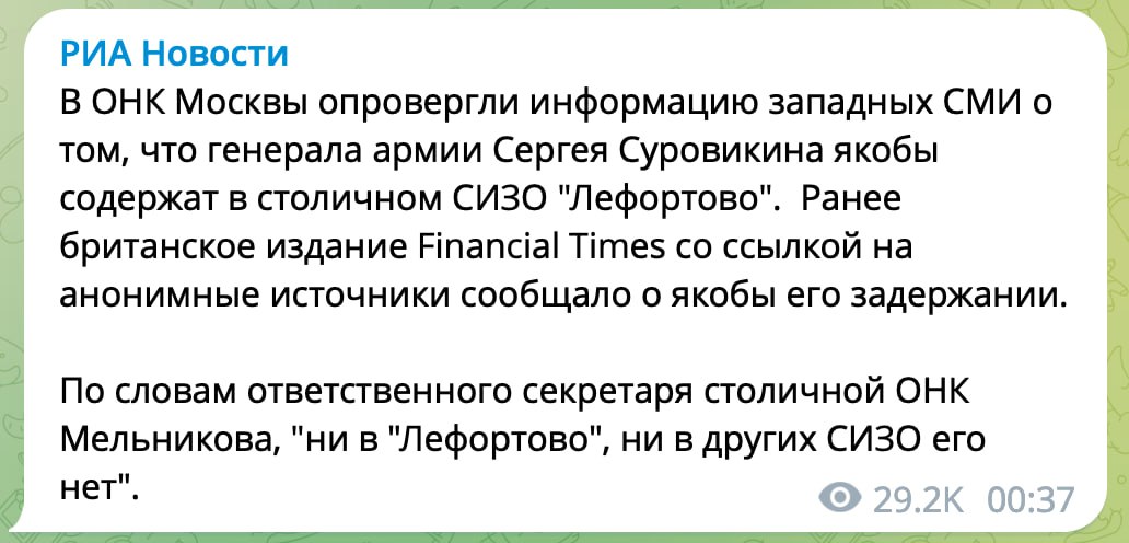Источники в Минобороны издания The Moscow Times утверждают, что генерал Суровикин арестован. Никаких официальных подтверждений этому пока нет. Напомню, что этот Суровикин - один из самых мерзких и безжалостных путинских генералов, за которым тянется длинный шлейф всяческих военных преступления: от массовых убийств мирного населения в Сирии, за что его прозвали "сирийским мясником" (Путин ему за это вручил побрякушку "Герой России") до военных преступлений в Украине. Подробнее почитать об этом персонаже можно здесь и здесь.
